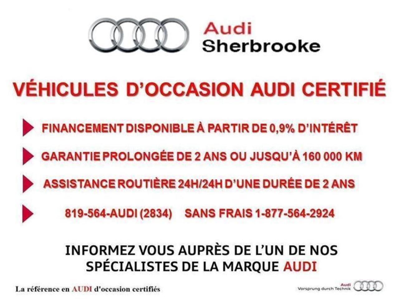 *** MAINTENANT OUVERT LE SAMEDI *** GARANTIE CERTIFIÉE DISPONIBLE JUSQU'AU 8 Octobre 2019 OU 160 000 KMPlusieurs véhicules de toutes marques en inventaire prêts pour une prise de possession rapide. De plus, Audi Sherbrooke vous offre le plus grand choix de véhicules d'occasion Audi en Estrie. Tous nos véhicules d'occasion sont minutieusement inspectés et réparés avec soin par nos techniciens certifiés *** FINANCEMENT À PARTIR DE 0.9% *** Nous vous donnons le meilleur prix pour votre échange, spécialistes sur place, 1iere, 2ieme ou 3ieme chance au crédit. Vous pouvez nous rejoindre en tout temps, notre équipe professionnelle et certifiée saura vous offrir une expérience d'achat personnalisée pour l'achat de votre prochain véhicule d'occasion certifié. Un rapport CarProof vous est remis sur demande lors de l'achat. Venez nous rencontrer 4319 Blvd Bourque, Sherbrooke 1 (855) 781-7889 ou visitez www.audisherbrooke.com/usage pour l'inventaire complet!!!! Garantie Certifié disponible, informez-vous auprès de l'un de nos conseiller