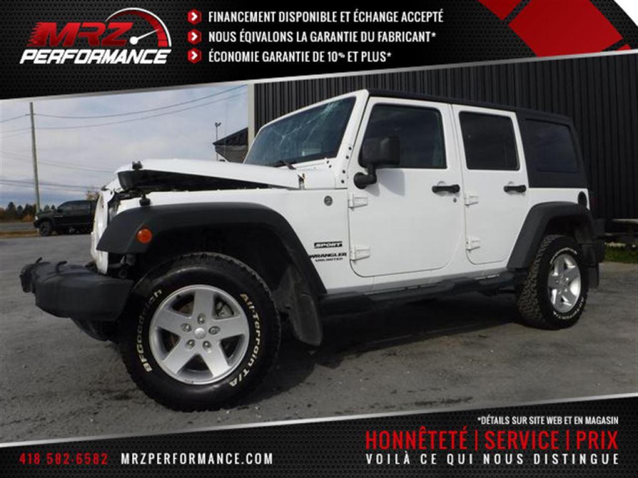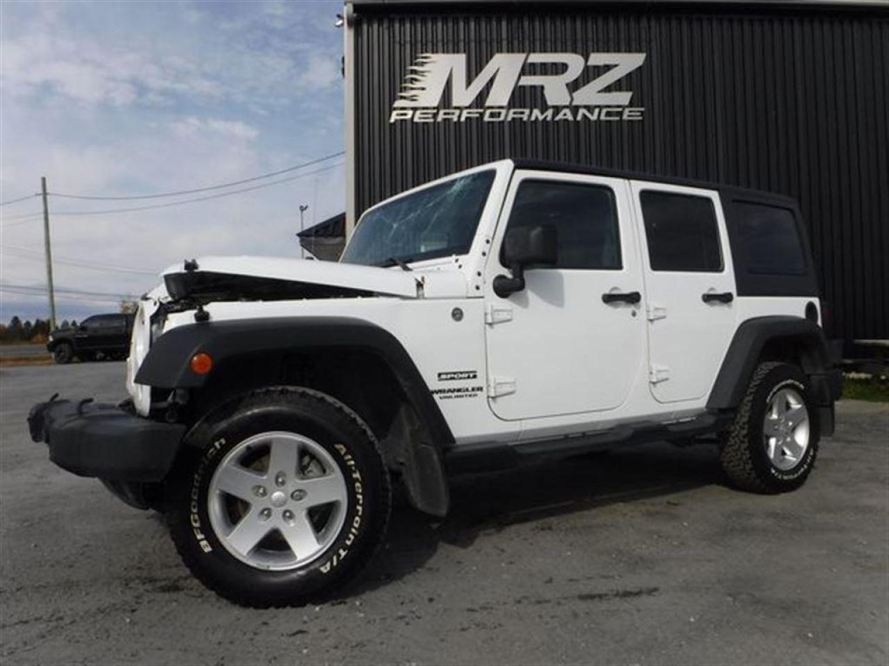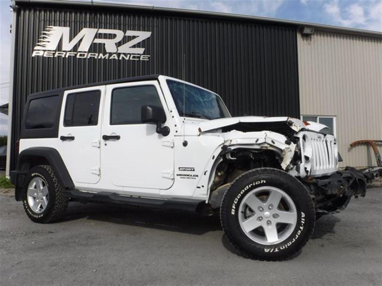 Jeep Wrangler Sport 4X4 2015 Blanc. Véhicule très populaire, ne manquer pas la chance de vous procurez ce beau petit jouet! Idéal pour se promener hors des sentiers!! Très peu de kilo au compteur, Seul. 50 700km!! Superbe Jeep très facilement réparable à faible coût. Faites vite ces Jeep s'envolent comme des petits pains chauds!! Dommages très légers! * Visitez le WWW.MRZPERFORMANCE.COM pour tous les détails et beaucoup plus de photos! Super propre!! * Très bas kilométrage, seulement 50 700km - 4x4 Lo/Hi - Moteur V6 3.6l nouvelle génération avec transmission manuelle a 6 rapports - Très puissant, près de 300HP!! - Mags 17'' avec Pneus All Terrain LT245 70 R17 comme neufs!! - Modèle Sport bien équipé : - Vitres teintées - Commandes au volant - Chauffe-moteur - Prise 12V - Lecteur CD/MP3 - Wiper intermittents - Cruise control - Prise USB - Sélecteur 4WD/2WD - Fog lights - Flares texturés - Toit rigide texturé - Console centrale - 1X Clé - A/C - Marchepieds - Towing package - Garde boue - etc! Accidenté à l'avant seulement du véhicule. Pour la réparation, Besoin du Pad dash, Parebrise, Grille de wiper, Aile avec Fausse aile et Flare avant droit, Longeron supérieur droit, Hood, Rack de batterie, Lumière avant droit, Support radiateur, Radiateur, Condenseur, Fan, Grille avant, Bumper avant assemblé, Fog droit, Boitier filtre air, Traverse de métal avant et de quelques plastiques de finitions. A réparé: Marchepied de cabine avant droit (très léger), 2X Portes avant (léger), Cadre de parebrise, Aile avant gauche (ou a changer) et la Réserve lave glace ( ou a changer). La pointe de frame avant droit est a réparé. Les 2X Mags gauche sont égratignés. Très facilement réparable pour vraiment pas cher. Le ballon volant, Ballon passager ainsi que les 2X Ceintures avant sont déployées (très abordable chez le dealer). Tous les autres Ballons et les autres Ceintures sont intacts. L'option d'un Devant complet pourrait être pris en considération pour la réparation de ce véhicule. Nous pouvons vous fournir les pièces nécessaires à la réparation de ce véhicule à prix très compétitif. Disponible tel quel ou réparé par des professionnels et inspecté par la SAAQ - DIFFÉRENTIELS INTACTS!!! Pas d'impact subit dans les roues, suspension et direction en parfaite état!! Vraiment un superbe Wrangler Sport, VUS en demande!! Idéal pour faire du hors route!! Vraiment un très beau bijou à ne pas laisser passé!! Très peu de kilo au compteur!! Valeur neuf de plus de 37 000$ sur la feuille de vitre Jeep. Impossible de trouver meilleur qualité prix chez la compétition. Encore une fois Automobiles MRZ frappe fort avec les plus beaux véhicules sur le marché! ** VGA QUÉBEC / SALVAGE TITLE ** Plusieurs autres VUS ET CAMIONNETTES en inventaire - AUCUN CAMOUFLAGE DE DOMMAGES SUR NOS VÉHICULES! *** Membres AMVOQ - Venez nous voir ou allez visiter notre site internet pour plus d'informations! Automobiles MRZ, la référence dans l'accidenté léger au Québec! WE SPEAK ENGLISH PLEASE CONTACT US - MRZ IS THE VEHICLE CAR EXPORT AND IMPORT SPECIALIST - USA - AFRICA - MIDDLE EAST - EUROPE - MRZ EST LE SPÉCIALISTE EN EXPORTATION et IMPORTATION DE VÉHICULES - USA - AFRIQUE - EUROPE - PROCHE ORIENT Visitez-nous aussi sur Facebook! Merci!